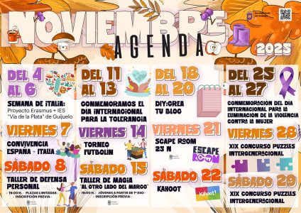 La agenda joven del mes de noviembre incluye muchas citas relacionadas con temática variada y en la que, además, destacan los días internacionales para la eliminación de la violencia contra la mujer y el día mundial para la tolerancia.
