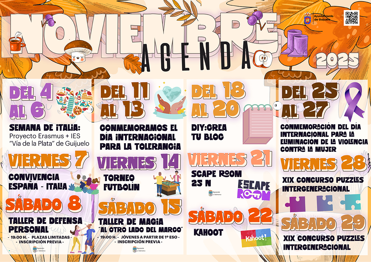 La agenda joven del mes de noviembre incluye muchas citas relacionadas con temática variada y en la que, además, destacan los días internacionales para la eliminación de la violencia contra la mujer y el día mundial para la tolerancia.